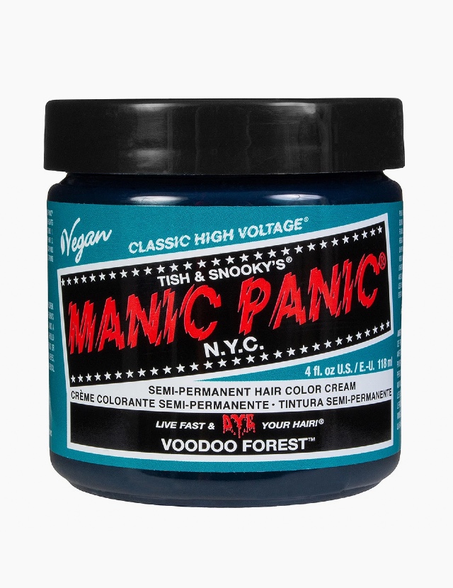 Voodoo Forest è un colore verde petrolio che può aggiungere riflessi blu-verdi a capelli vergini (max. livello 4), non decolorati ma per ottenere risultati ottimali, consigliamo di schiarire i capelli fino al raggiungimento di un biondo chiaro (livello 9).